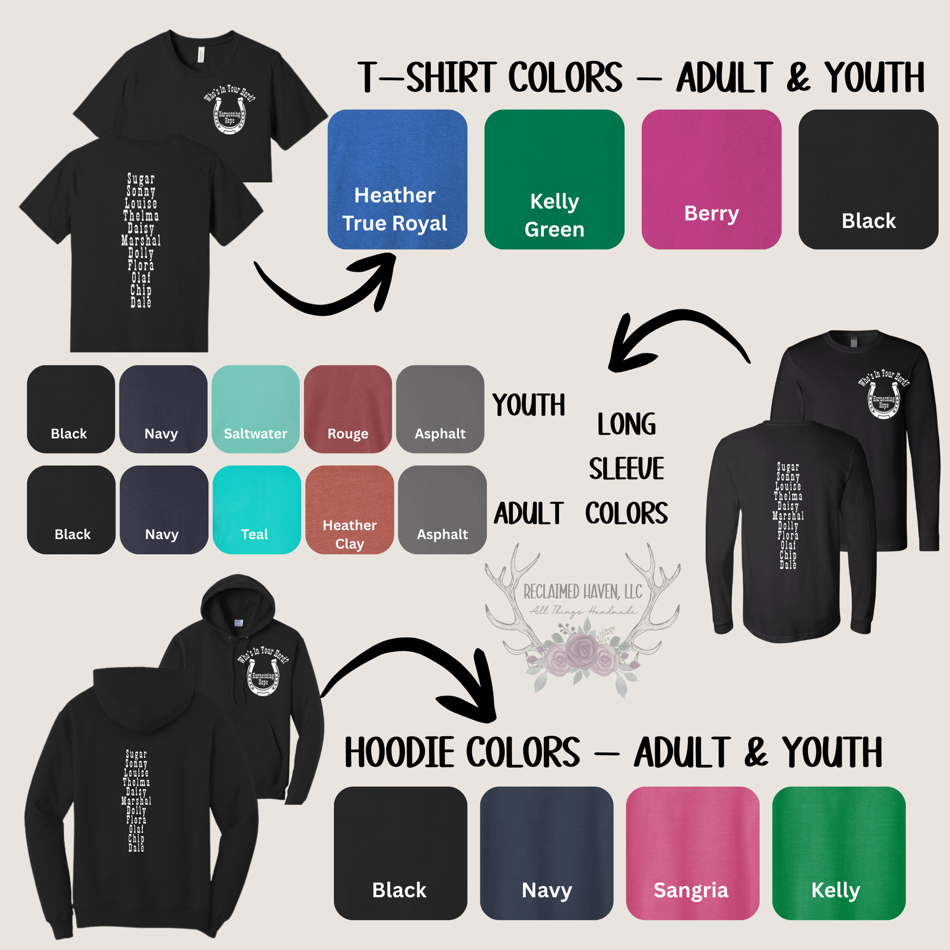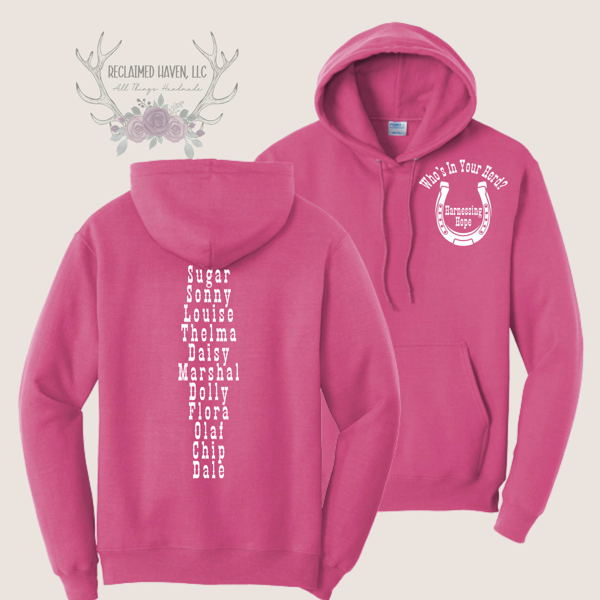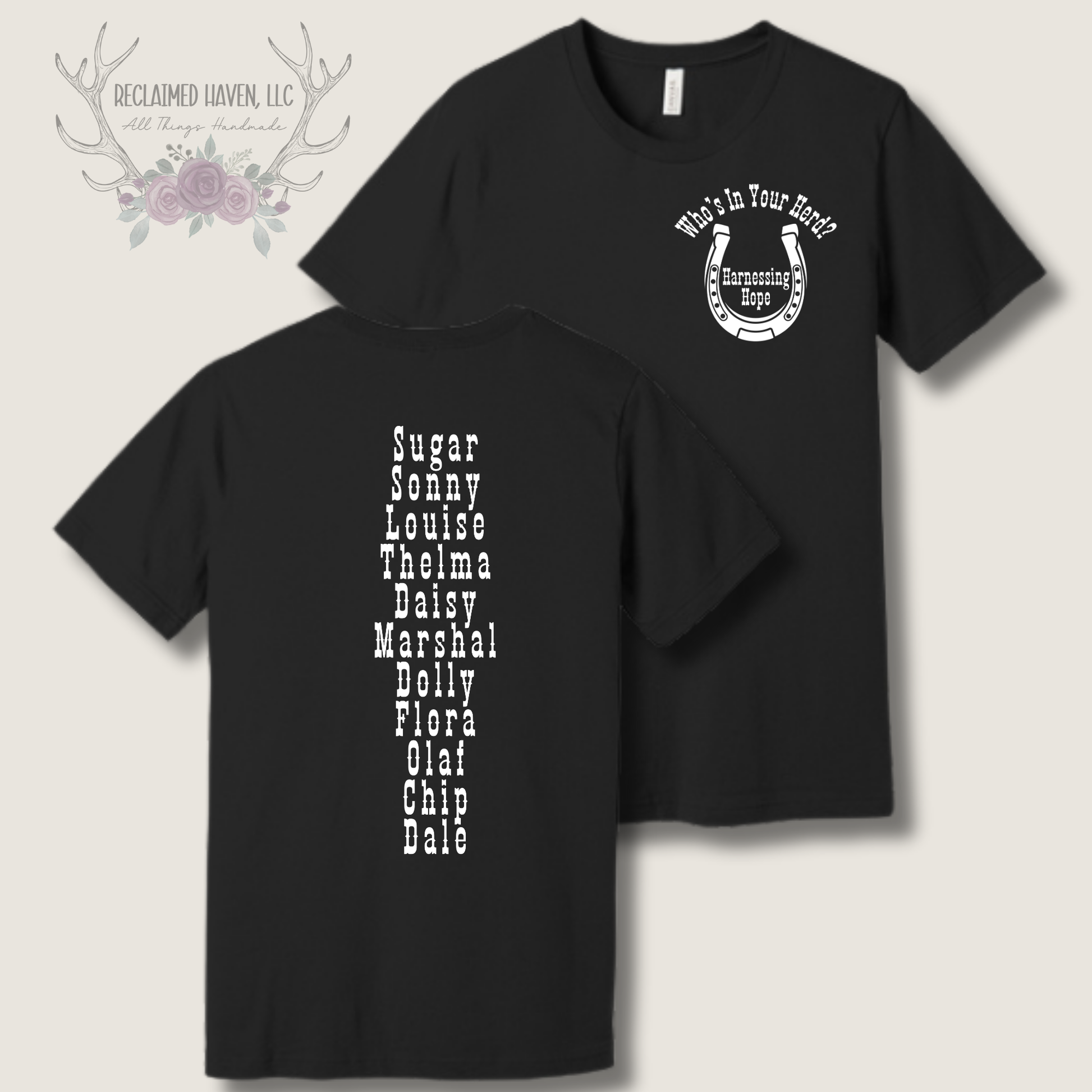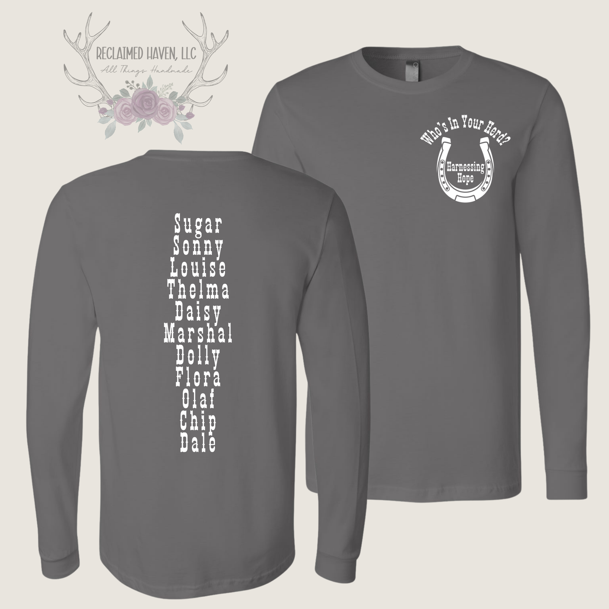 Help represent Harnessing Hope with their exclusive design showcasing who is in their herd with a t-shirt, long sleeve or hoodie.